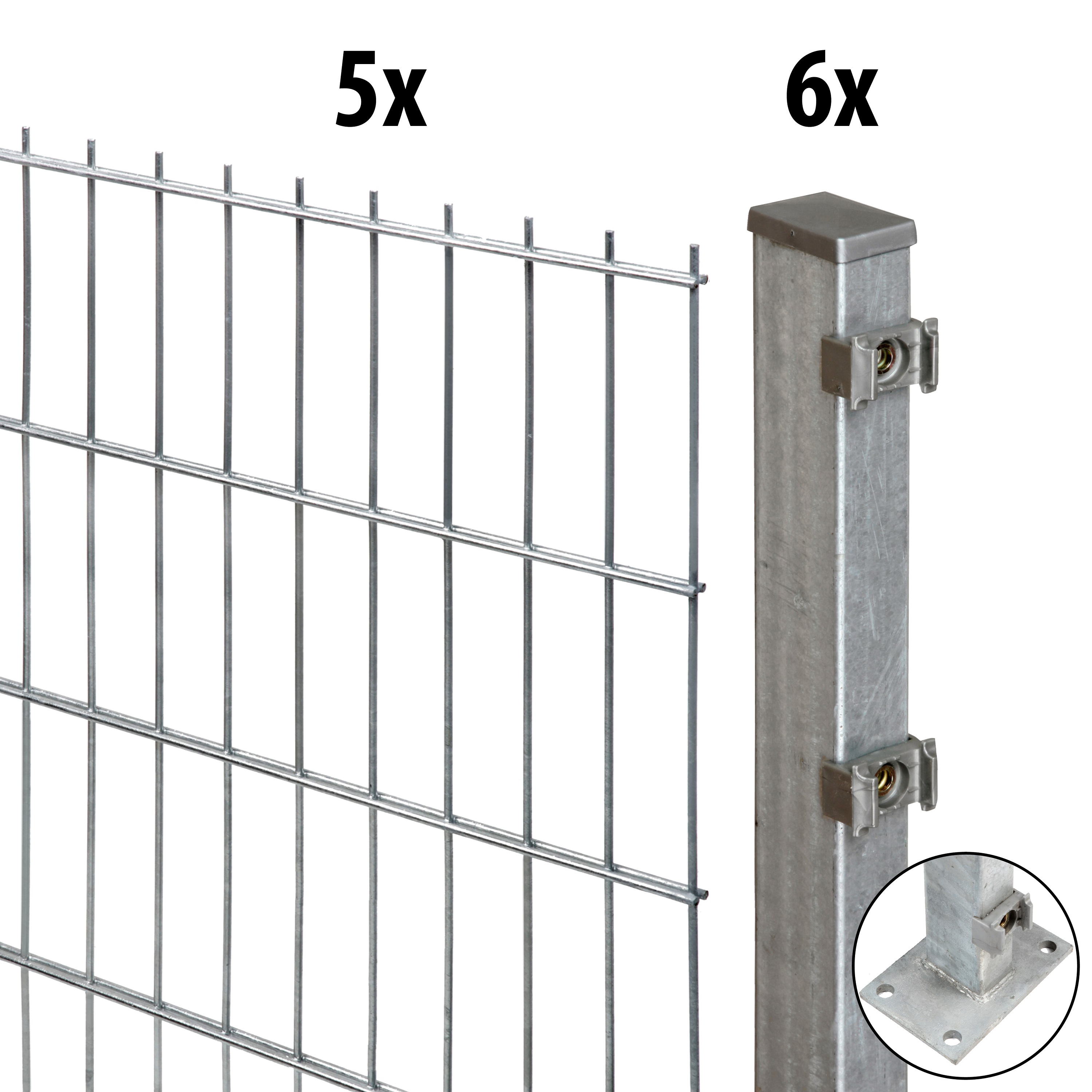 Lieferumfang: 5 St. Doppelstabmatten 201x103 cm, 6 St. Zaunpfosten 60/40 L: 109 cm, Pfosten mit Bodenplatte