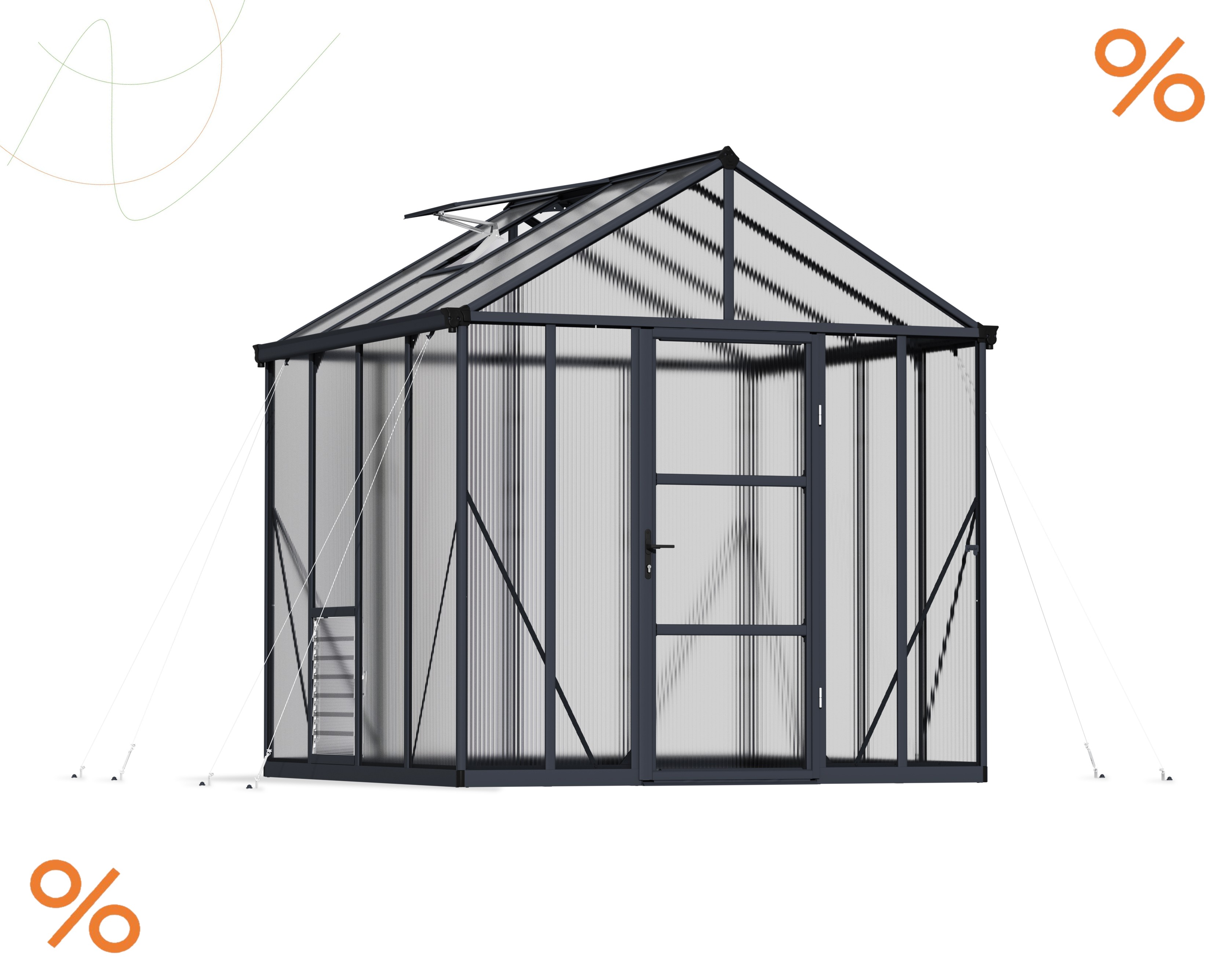 Das Gewächshaus Glory hat einen grauen, pulverbeschichteten Aluminiumrahmen und wird mit einem verzinkten Stahlsockel geliefert, der für noch mehr Höhe, strukturelle Unterstützung und Stabilität sorgt. In Kombination mit den 10 mm starken, schlagfesten, doppelwandigen Polycarbonat Paneelen erhalten Sie ein Gewächshaus, das ebenso widerstandsfähig und funktionell wie ästhetisch ansprechend ist.