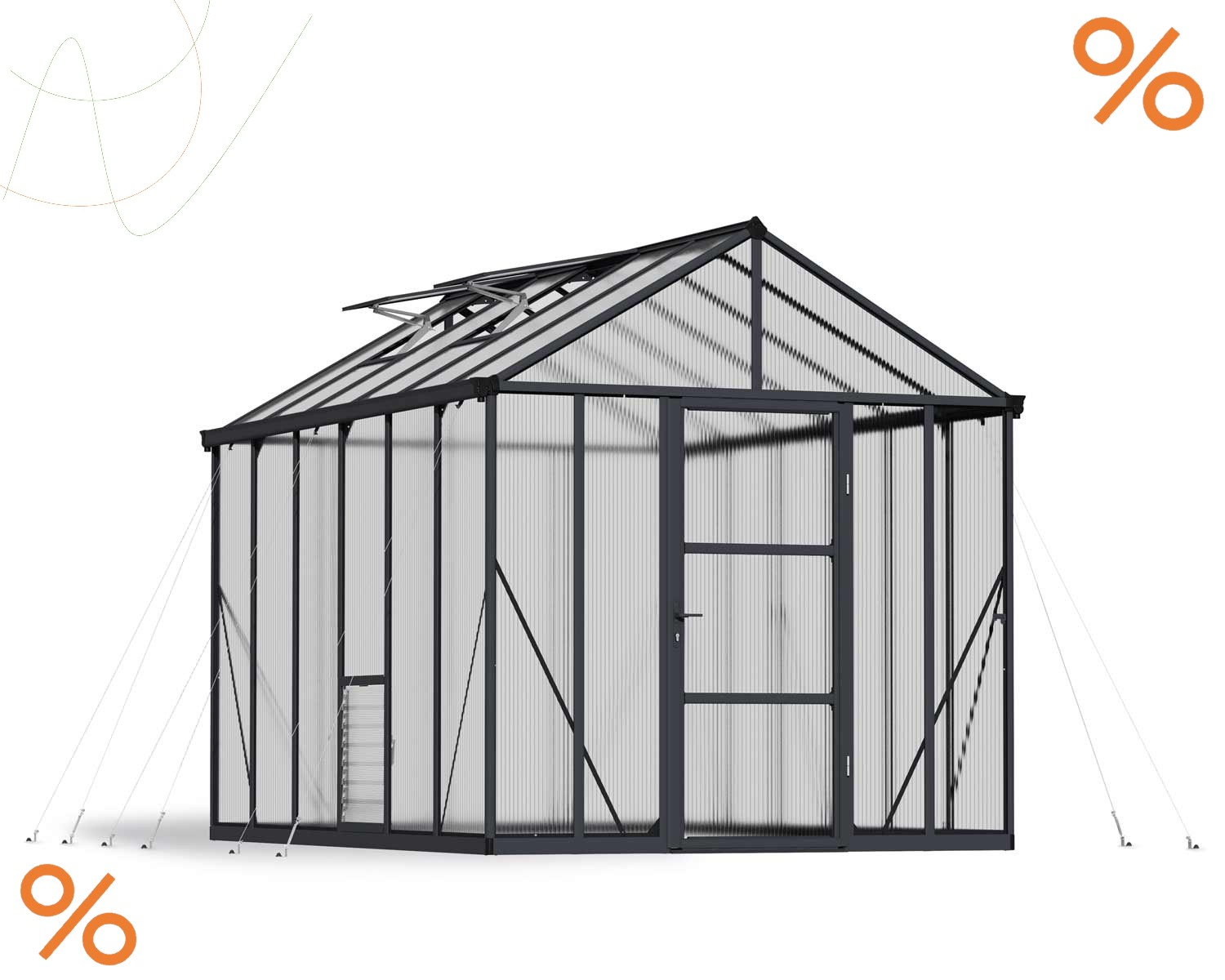 Das Gewächshaus Glory hat einen grauen, pulverbeschichteten Aluminiumrahmen und wird mit einem verzinkten Stahlsockel geliefert, der für noch mehr Höhe, strukturelle Unterstützung und Stabilität sorgt. In Kombination mit den 10 mm starken, schlagfesten, doppelwandigen Polycarbonat Paneelen erhalten Sie ein Gewächshaus, das ebenso widerstandsfähig und funktionell wie ästhetisch ansprechend ist.