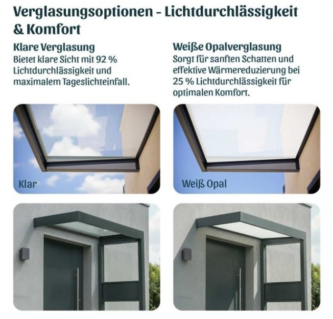 Verleihen Sie Ihrem Eingangsbereich modernen Stil und optimalen Schutz mit dem Sophia Türvordach und der passenden Seitenwand.