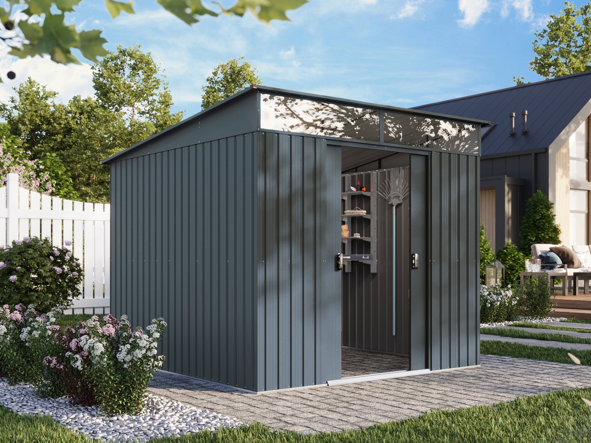 Komfortables Gerätehaus mit breiten Schiebetüren und Lichtband (2mm Polycarbonat)