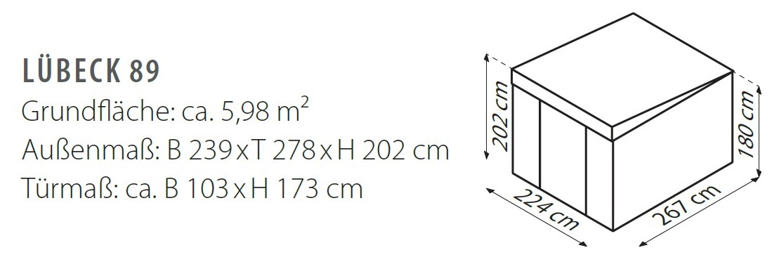 Mit dem Gerätehaus Lübeck schaffen Gartenbesitzer Ordnung im Garten - und behalten dabei leicht die Übersicht über ihr verstautes Gut: Ein Lichtband zwischen Dach und Tür in der Frontseite lässt Tageslicht hinein, die 1,70 bis 2,02 m hohen Seiten erlauben den meisten Nutzern eine durchgängige Stehhöhe in der Bewegungszone des Gerätehauses.