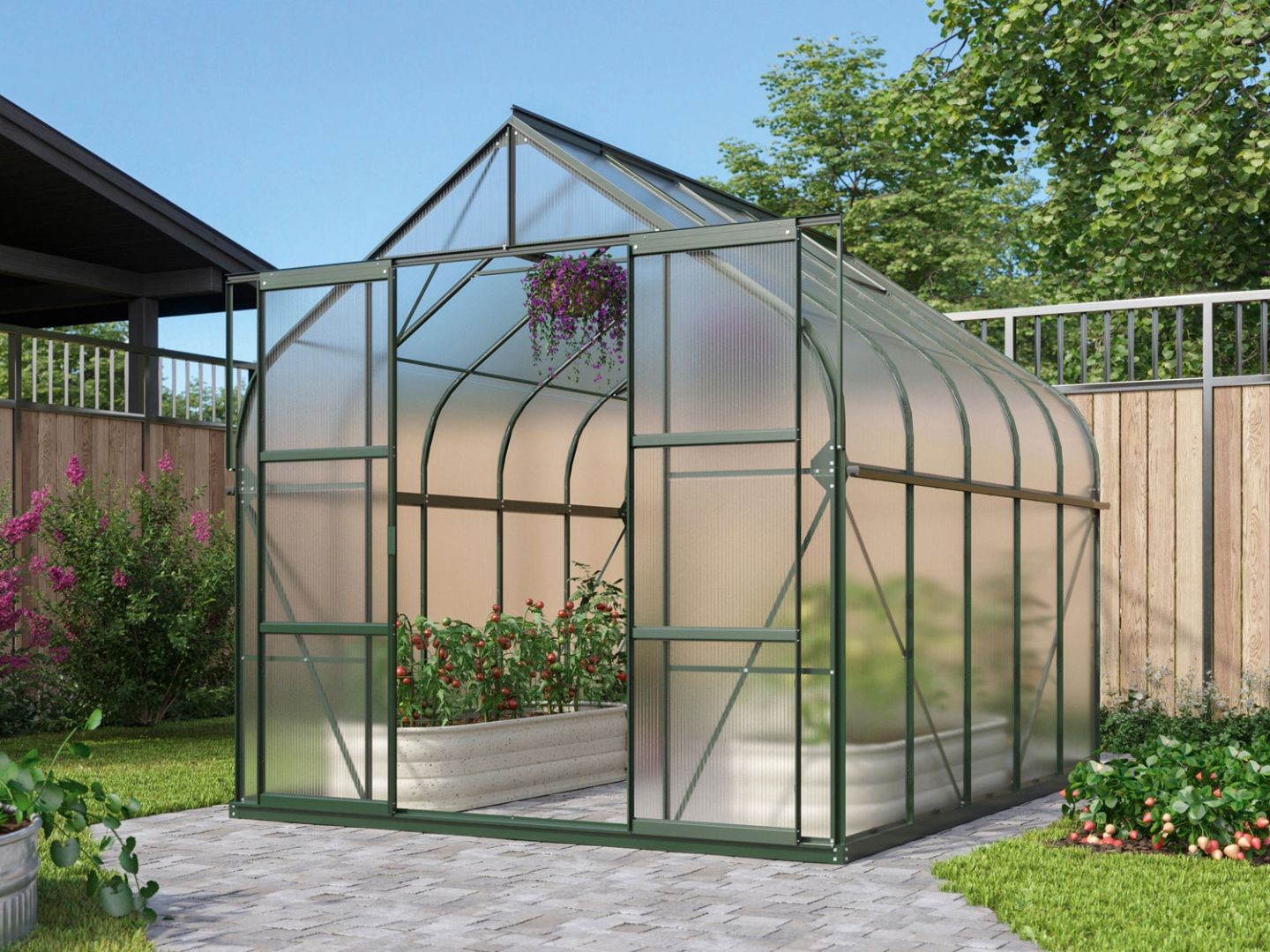 Mit seinem seitlich abgerundeten Dach fügt es sich perfekt ins Landschaftsbild ein und sorgt das ganze Jahr für frische Kräuter, gesundes Gemüse und blühende Pflanzen.
