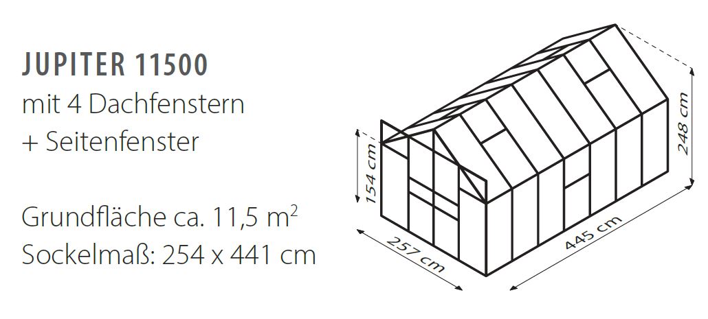 Das Jupiter ist in vier verschiedenen Größen mit Grundflächen von 6,7 bis 11,5 m² und in drei Farben erhältlich: Aluminium eloxiert, Smaragd oder Schwarz pulverbeschichtet. Alle Modelle sind lüftungsoptimiert: Das mitgelieferte Seitenfenster eröffnet in Kombination mit den Dachfenstern und der Doppelschiebetür eine optimale Luftzirkulation im Gewächshaus.