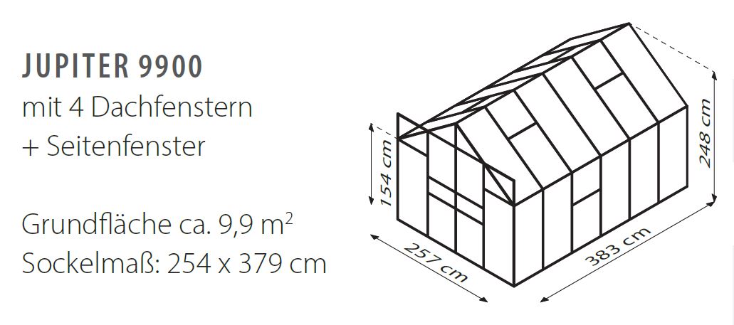 Das Jupiter ist in vier verschiedenen Größen mit Grundflächen von 6,7 bis 11,5 m² und in drei Farben erhältlich: Aluminium eloxiert, Smaragd oder Schwarz pulverbeschichtet. Alle Modelle sind lüftungsoptimiert: Das mitgelieferte Seitenfenster eröffnet in Kombination mit den Dachfenstern und der Doppelschiebetür eine optimale Luftzirkulation im Gewächshaus.
