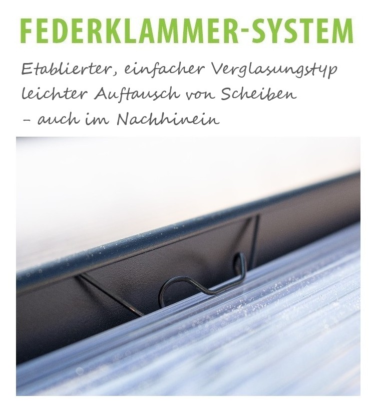 Verglasungstechnik: Etablierte Federklammertechnik, einfaches Einsetzen und Austauschen der Hohlkammerplatten - auch nachträglich