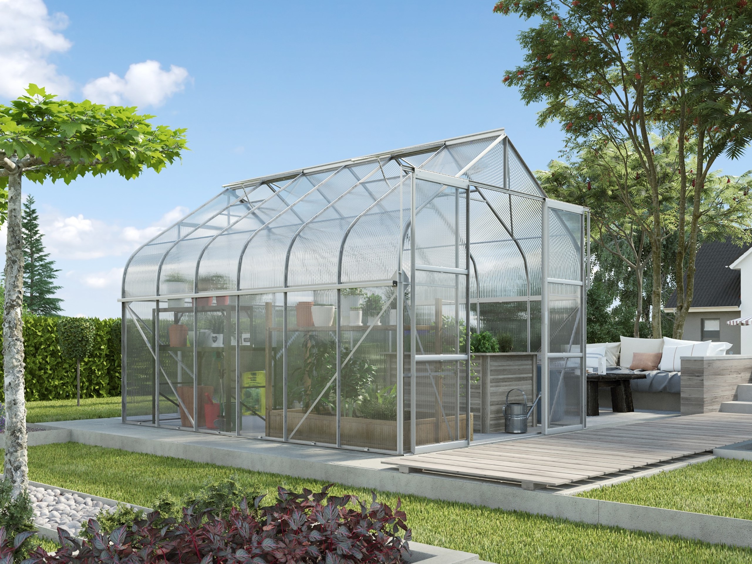Das elegante und formschöne Aluminiumgewächshaus DIANA ist ein Schmuckstück für jeden Garten.