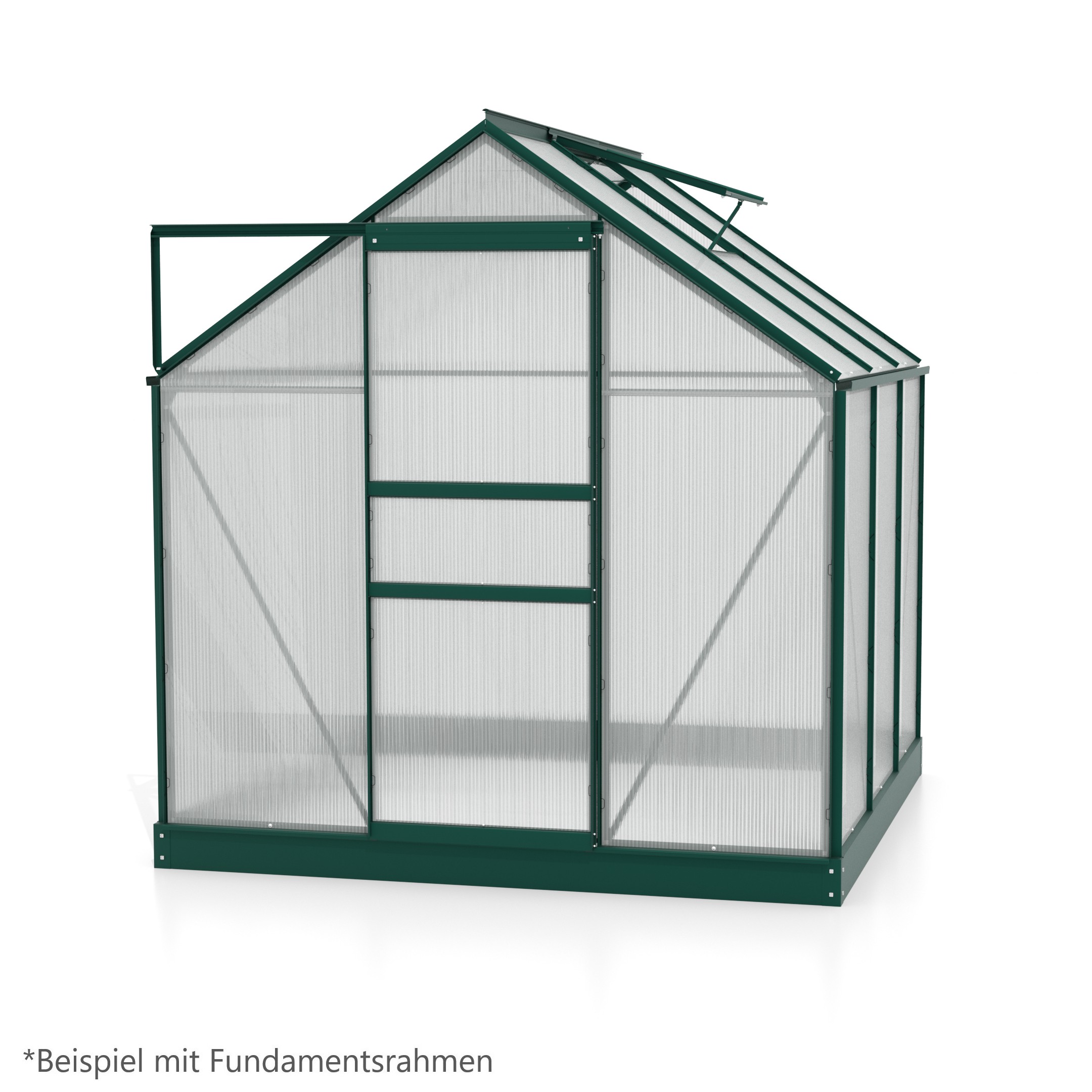 Für den ebenerdigen und rechtwinkligen Aufbau des Gewächshauses ist ein Fundamentrahmen aus verzinktem und farbbeschichtetem Stahlblech besonders hilfreich.